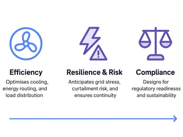 Reduce waste and strengthen continuity by optimizing cooling, energy routing, load distribution, and grid-stress risks.
