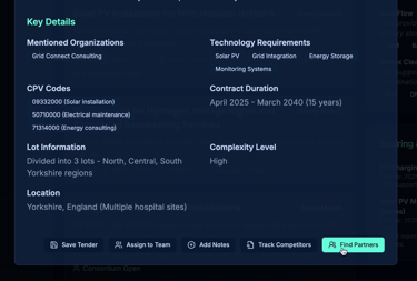 Spot high-value tenders early, assess them with precision, and connect with the right partners.
