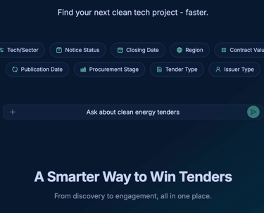 Our vertical, agentic AI is designed for cleantech procurement teams, CFOs, and CTOs. It enables them to collaboratively discover and develop winning tender applications. By replacing generic tools with a specialized, integrated solution, we seamlessly integrate tender discovery, project management, and consortium building.
