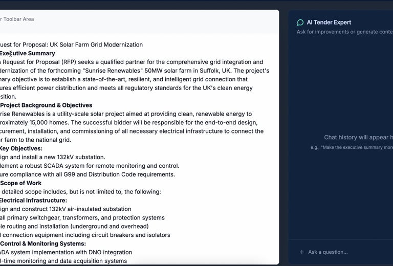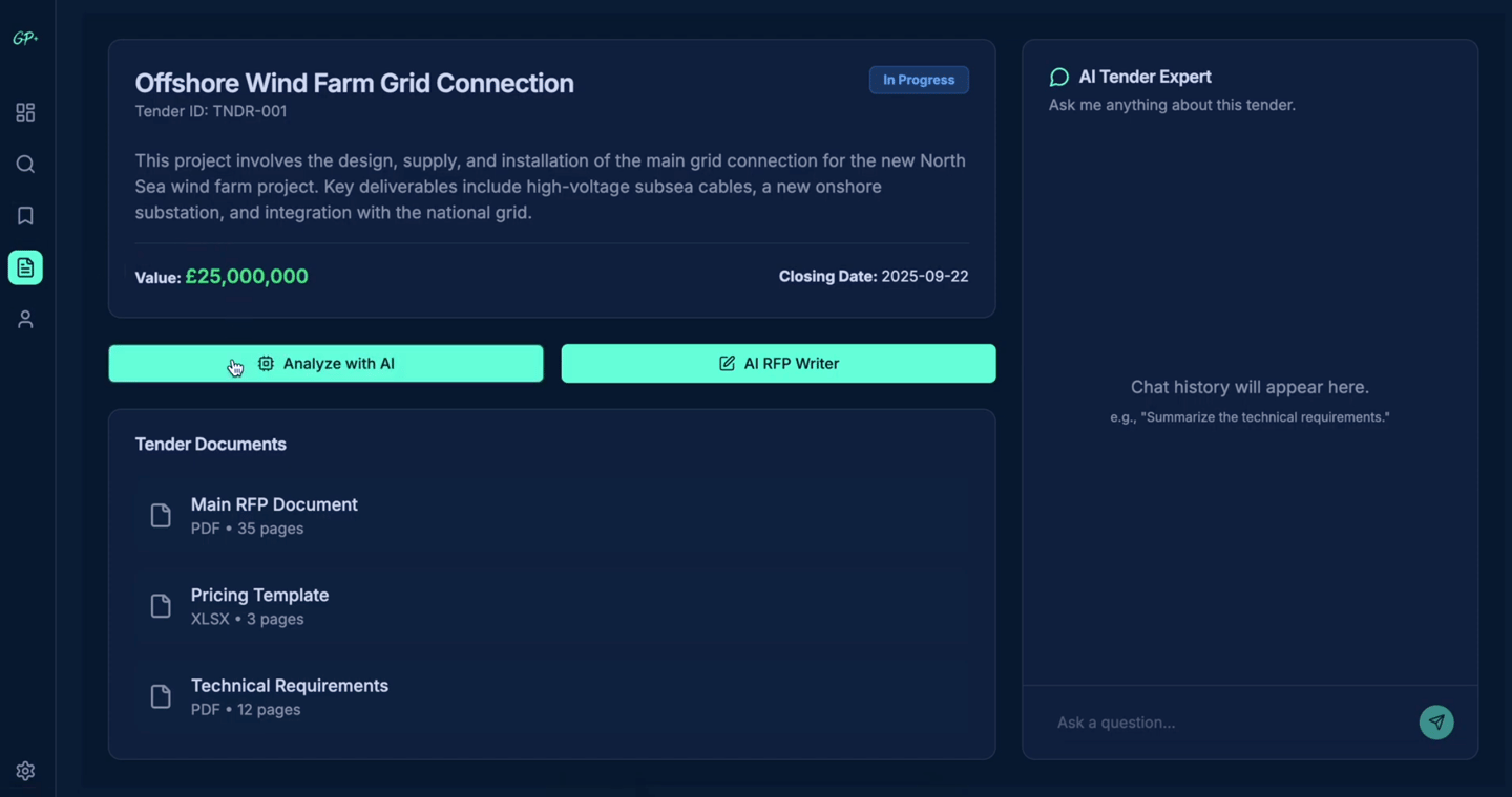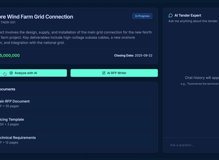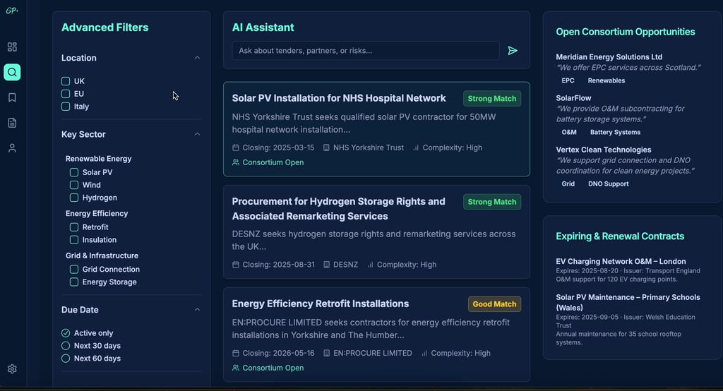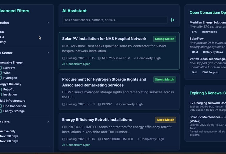 Our vertical, agentic AI is designed for cleantech procurement teams, CFOs, and CTOs. It enables them to collaboratively discover and develop winning tender applications. By replacing generic tools with a specialized, integrated solution, we seamlessly integrate tender discovery, project management, and consortium building.
