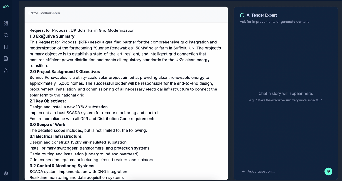 Draft customized applications quickly, enhancing your chances of winning cleantech tenders effortlessly.